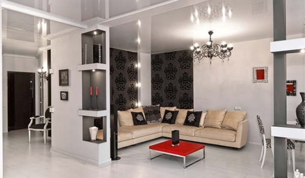 - Чёрно-белое оформление гостиной в стиле модерн с использованием большого количества цветовых деталей