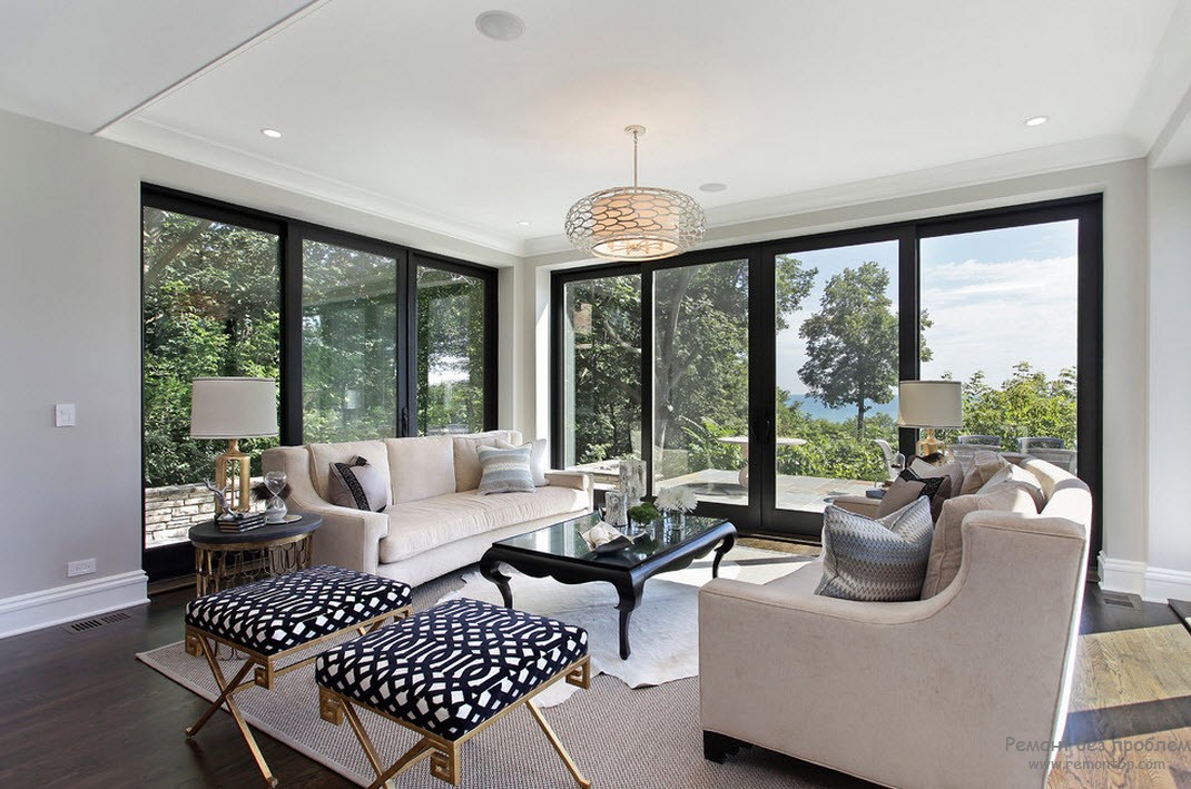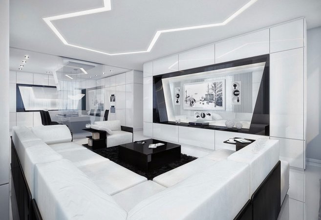 Фотогалерея: преобладание белого или чёрного цвета в интерьере гостиной
