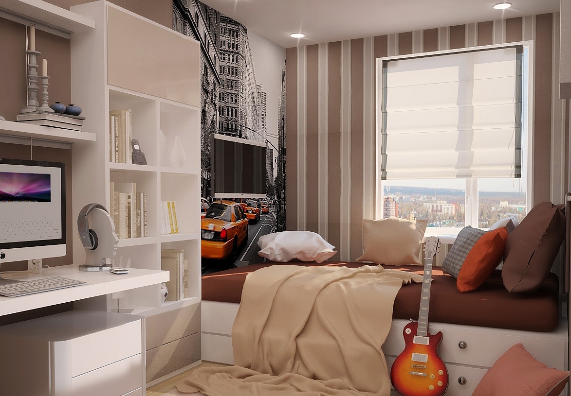 Наиболее предпочтительным для маленькой комнаты является сочетание белого и бежевого, бежевого и серого, бежевого и светло-коричневого цветов. Это универсальные оттенки, которые не надоедают и не раздражают восприятие.
