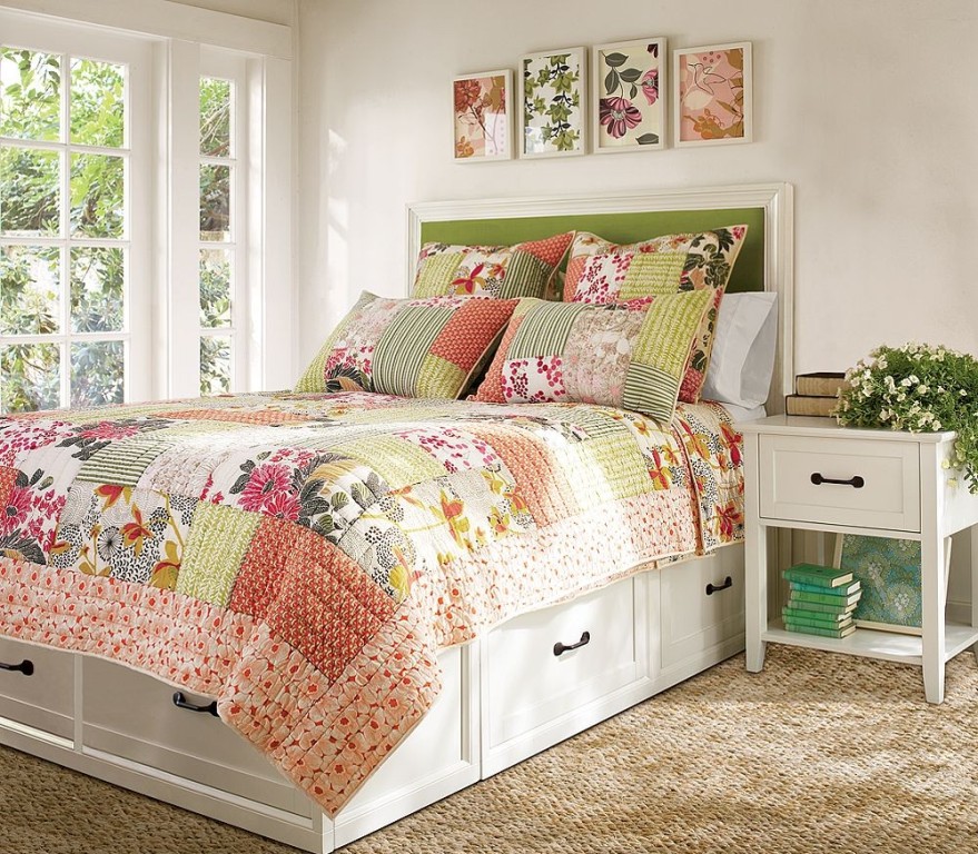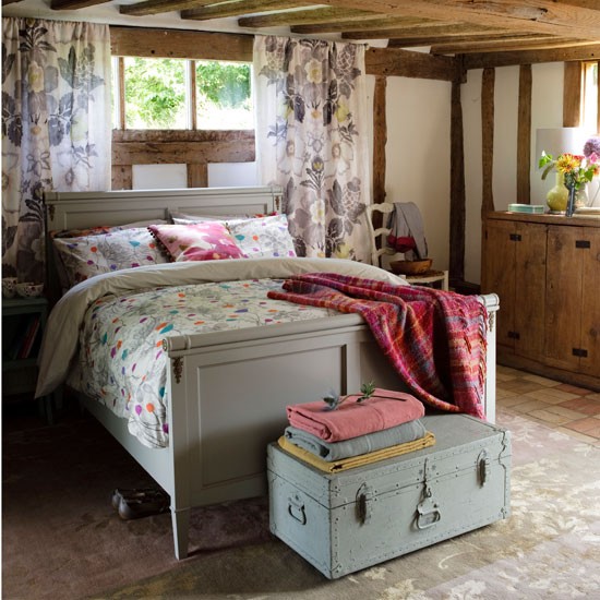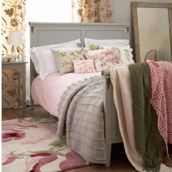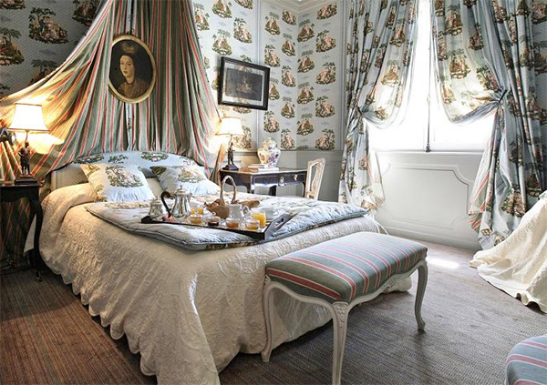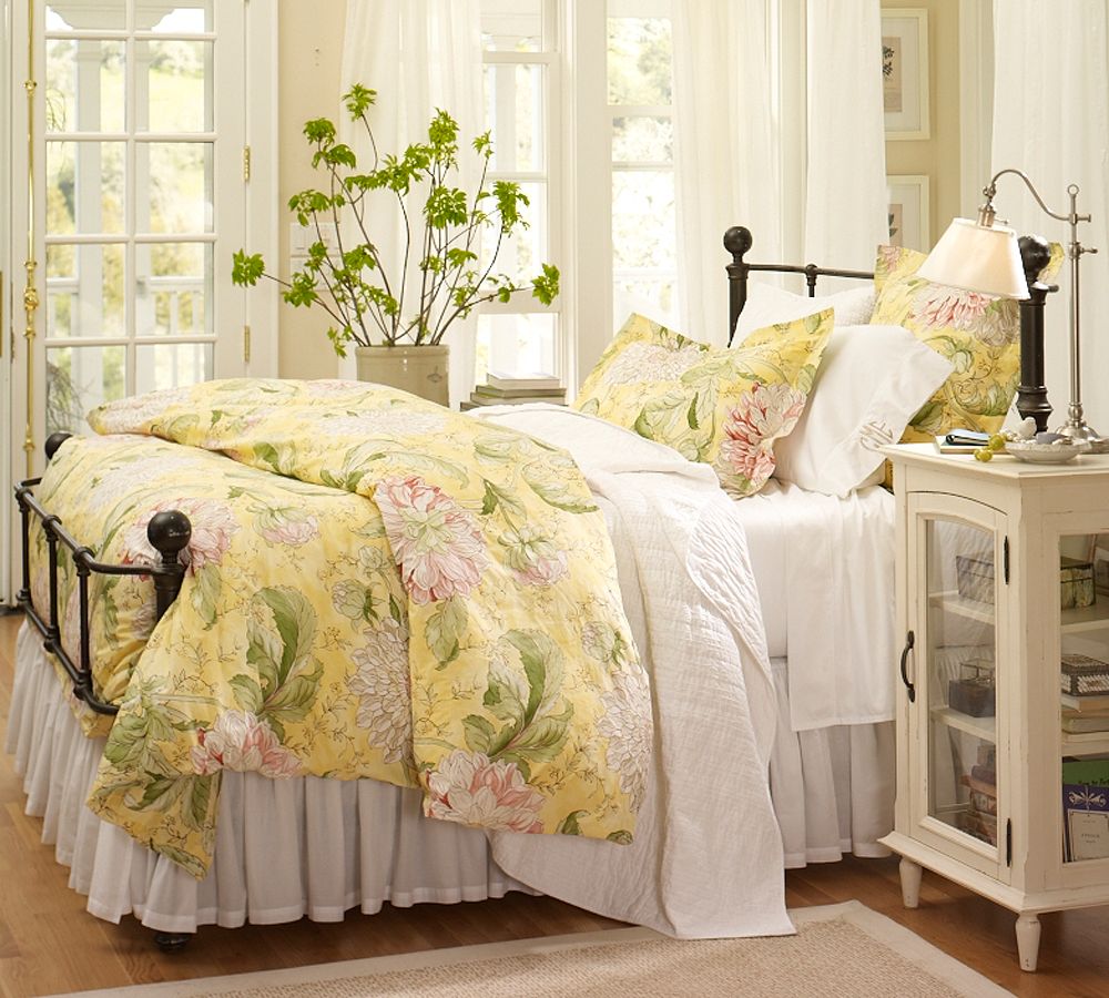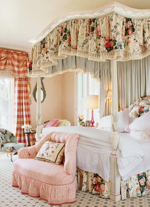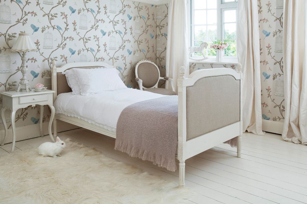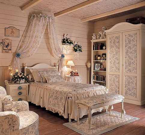 Цветочный орнамент (розы, лаванда, маки), натуральные ткани, отсутствие пышных складок и ламбрекенов для штор — это особенности стиля прованс. Это компенсируется богатым убранством кровати — там допустимы даже кружева. Орнаменты на текстиле могут отличаться — это не испортит впечатление, а подчеркнёт эклектичность стиля. Для завершения образа над кроватью можно установить воздушный балдахин. Чаще всего используются лён, хлопок ситец.