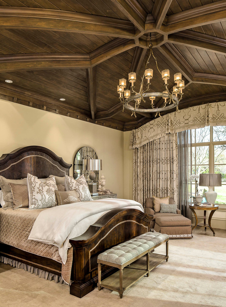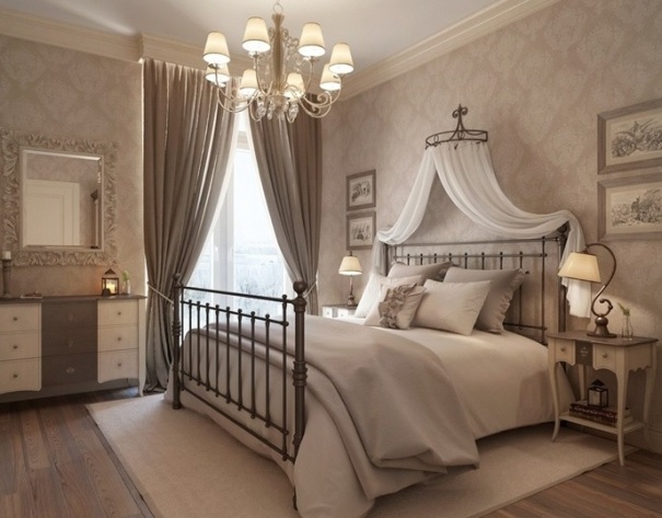 В интерьере должны быть светильники разного вида и места размещения. В тренде также кованные люстры на цепях и люстры из хрусталя с бусинками. На тумбочки возле кровати ставят керамические лампы с текстильными плафонами.