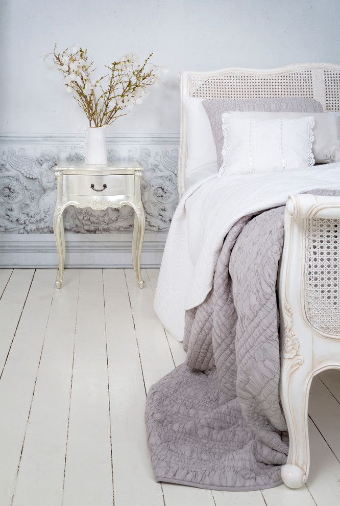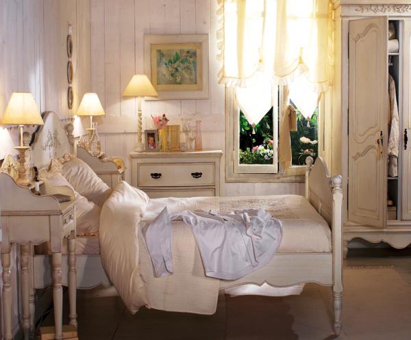 В спальне Прованс должна быть не только красивая кровать — кованая или деревянная, но и комод, банкетка, стулья, кресло-качалка, изящный туалетный столик и пуф. Все эти предметы могут быть по-деревенски грубыми, или, наоборот — по-королевски изящными. Лучший выбор — антикварная мебель, но хорошо впишутся и искусственно состаренные предметы. Если состарить красиво мебель невозможно, то её можно просто окрасить в белый цвет.