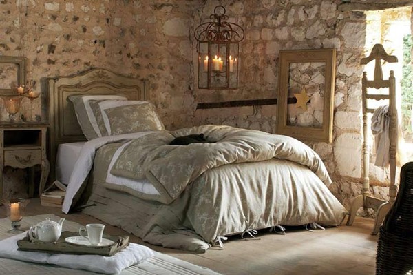 Если помещение будущей спальни невелико, то его оформляют так. Стену над изголовьем кровати отделывают камнем или декоративным кирпичом. Можно также использовать деревянные панели. Остальные стены оклеиваются обоями в мелкий цветочек. Пол накрывается паркетной доской или качественным ламинатом, имитирующим грубое дерево. Центральный объект интерьера — это кровать, основной акцент делается на ней и на постельных принадлежностях. Постельное белье, покрывало и подушки должны быть выдержаны в стиле прованс. Рядом с кроватью можно разместить две прикроватные тумбочки с гнутыми ножками, состаренные методом браширования или лессировки. На них обычно ставятся две лампы с тканевыми плафонами, и цветы в вазе или горшке. Если позволяет место, напротив или рядом с кроватью устанавливается туалетный столик с зеркалом и стул. Также в спальне обязательно должен быть шкаф для вещей.