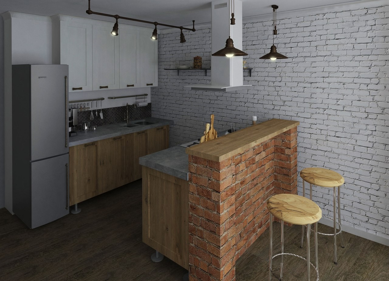 - Кирпичная барная стойка одновременно отделяет кухню от остальной части помещения