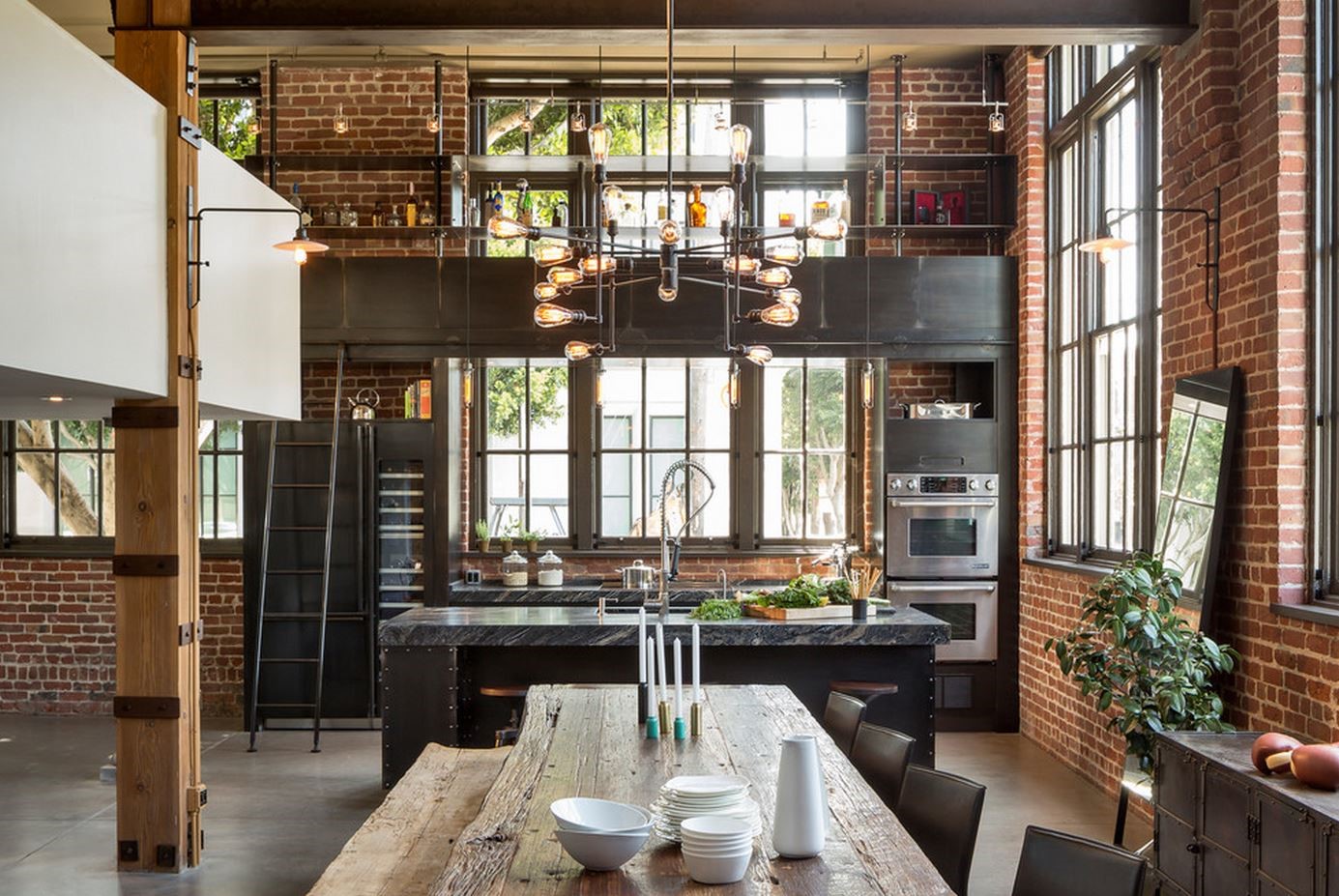 - Кухня в стиле лофт в частном доме: массивный стол со столешницей из досок на металлическом каркасе является изюминкой интерьера