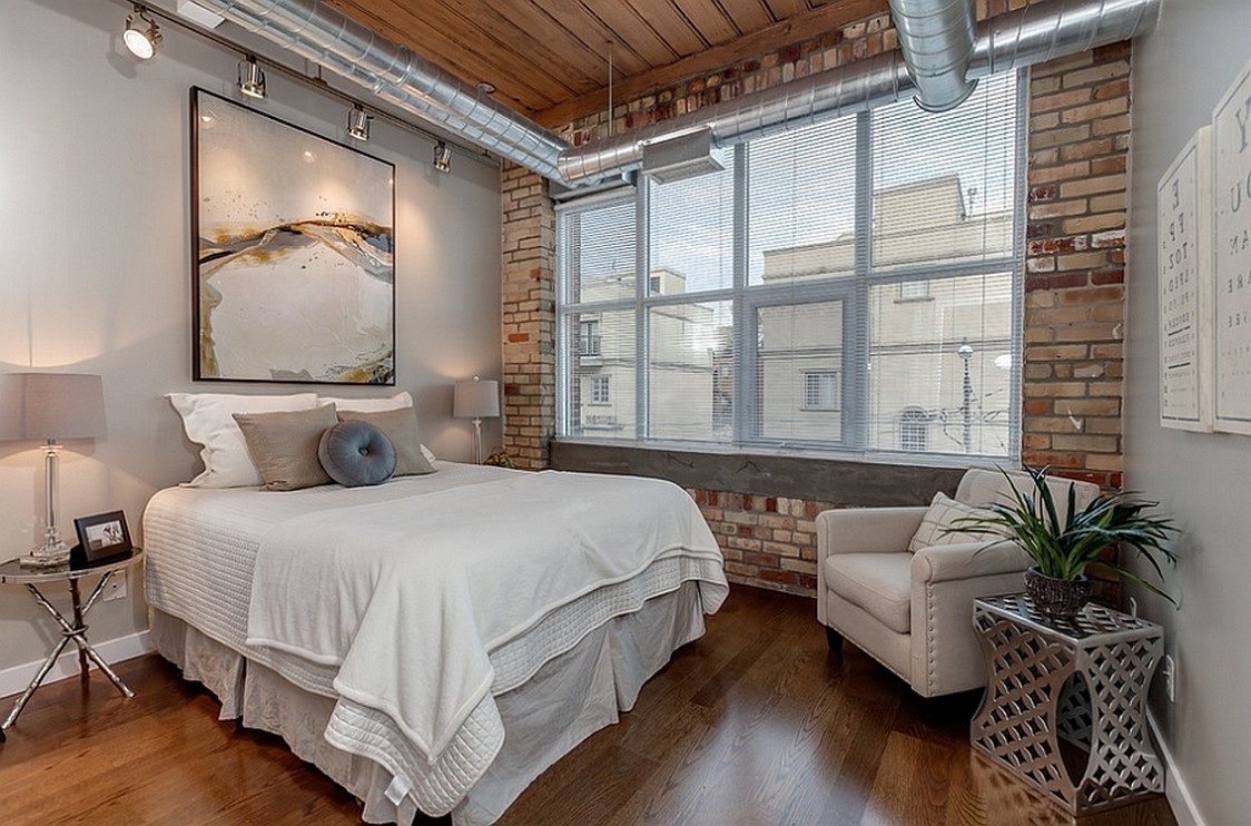 Спальни не только просторных апартаментов, но и небольших квартир можно стилизовать под лофт.