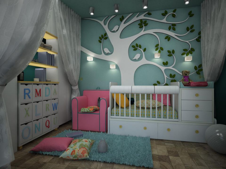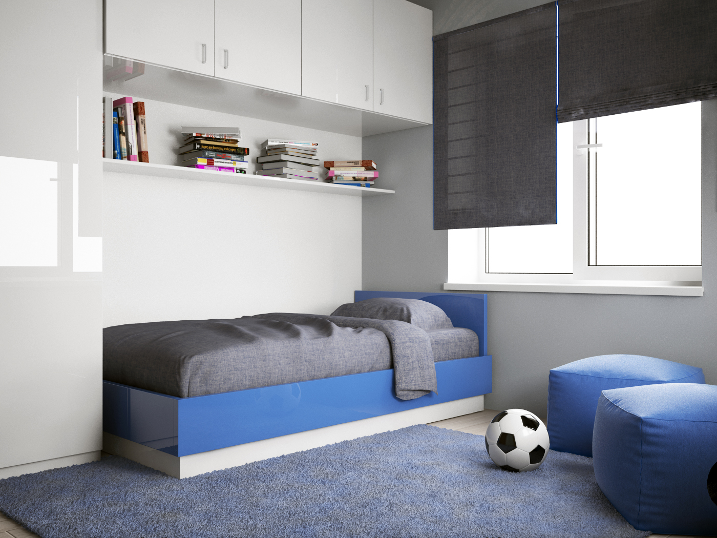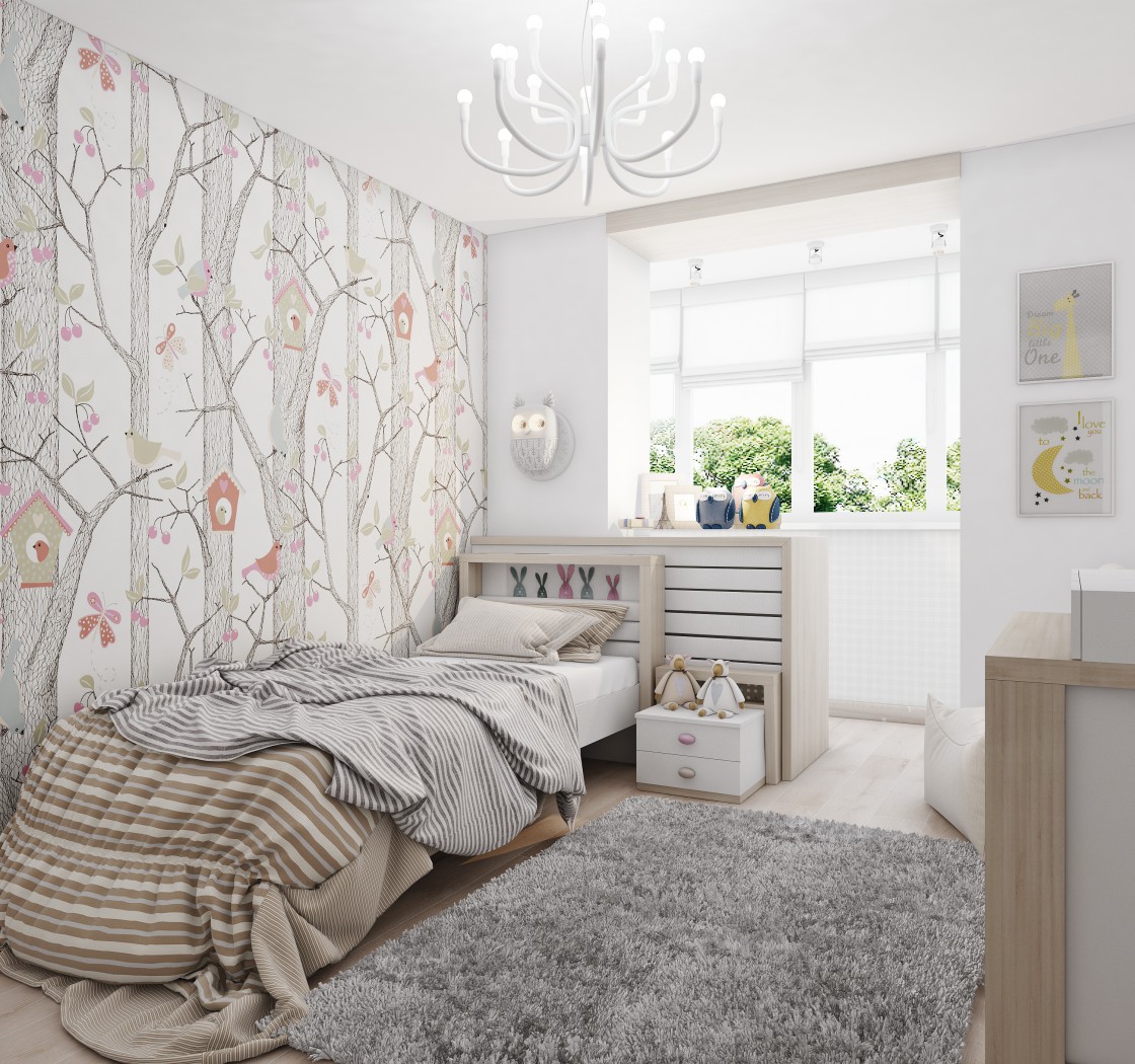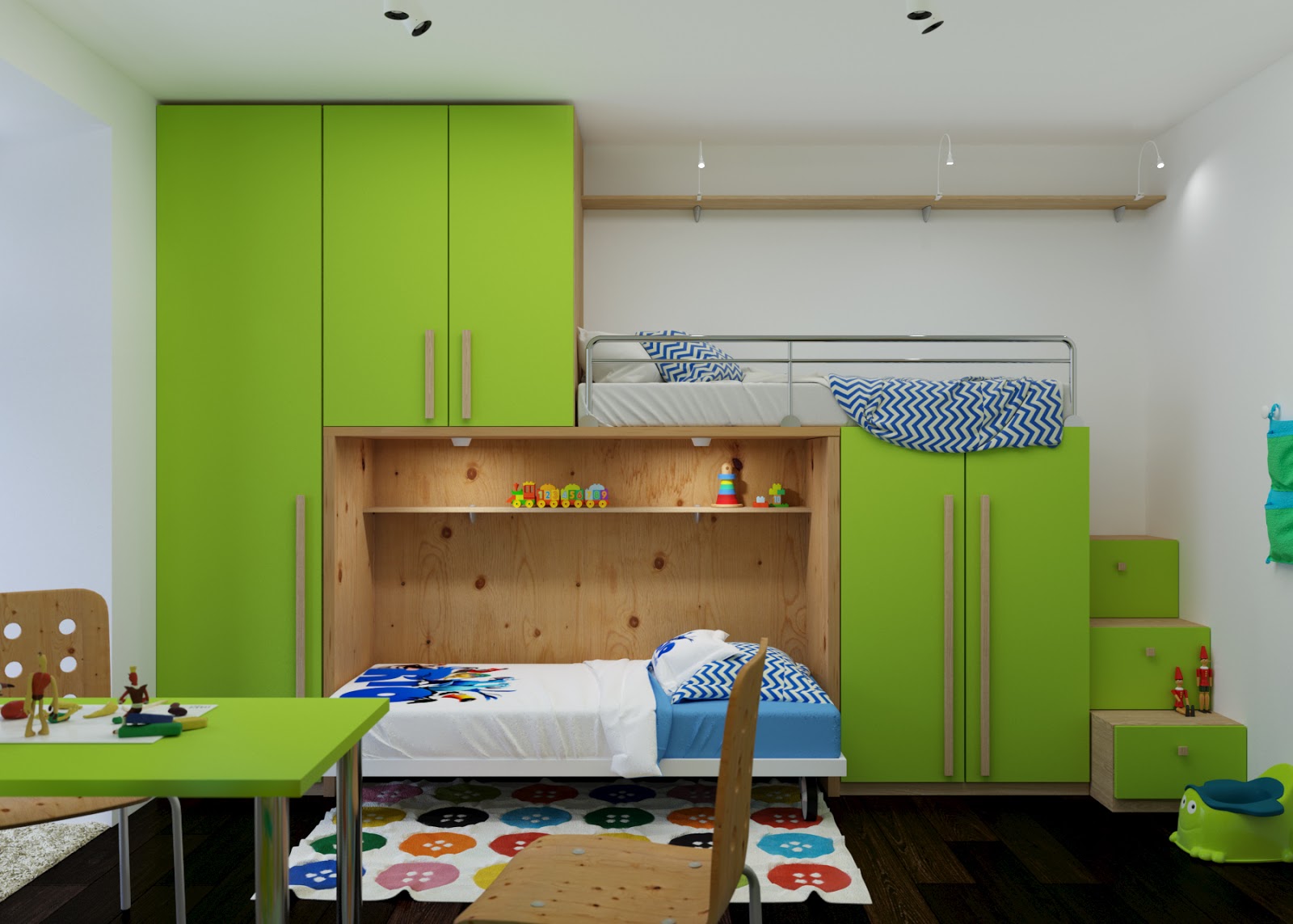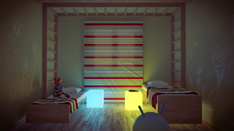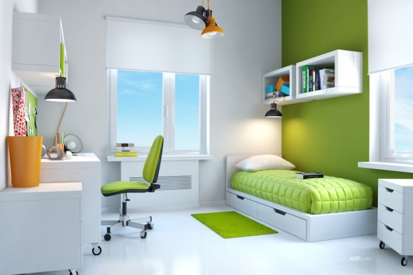 Оформление детской в стиле минимализм имеет свои особенности. Прежде всего, это использование ярких цветов, разноцветных светильников и подсветки. Функционализм проявляется в использовании раскладных кроватей с ящиками для вещей. Возможны вариации на тему дизайна, небольшой отход от строгого соблюдения канонов стиля для того, чтобы адаптировать комнату под ребёнка с учётом его возраста, пола и интересов.