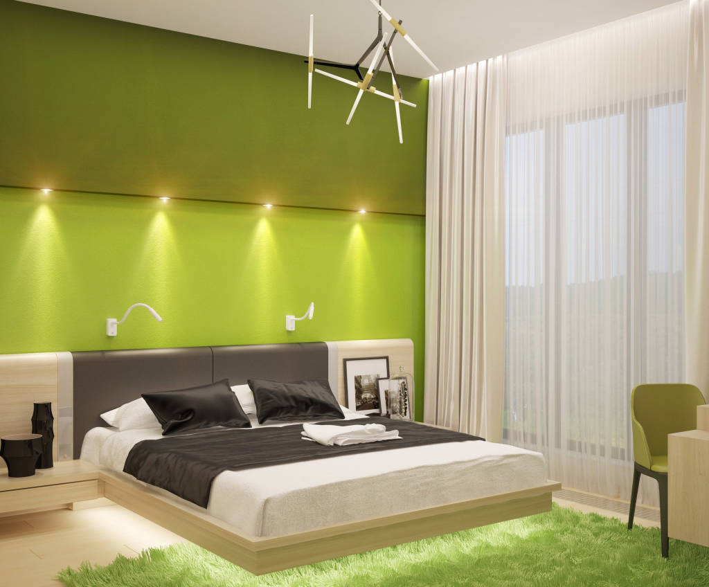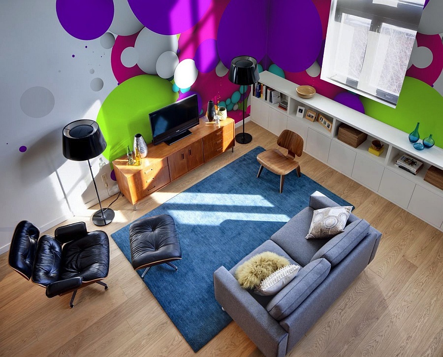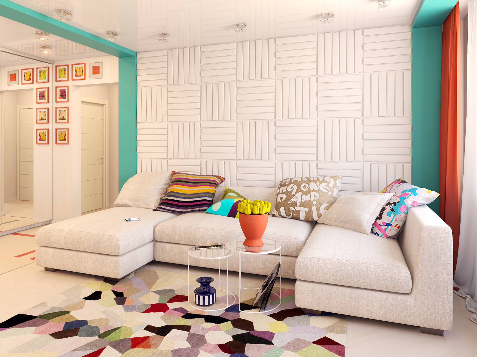 - Интерьер выдержан в минималистичном стиле, однако выглядит ярко благодаря наличию цветовых пятен на общем светлом фоне