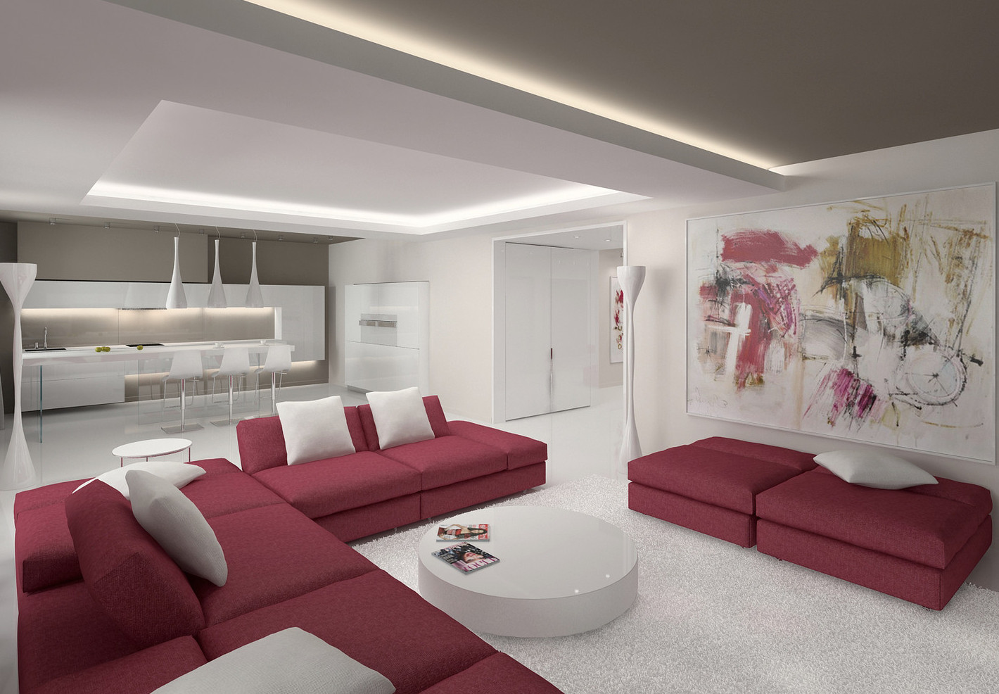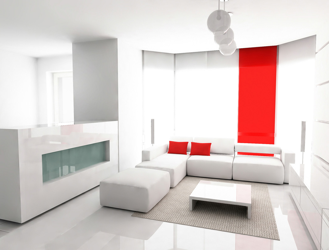 - Традиционное для минимализма цветовое решение: доминирующие светлые тона и яркое красное цветовое пятно