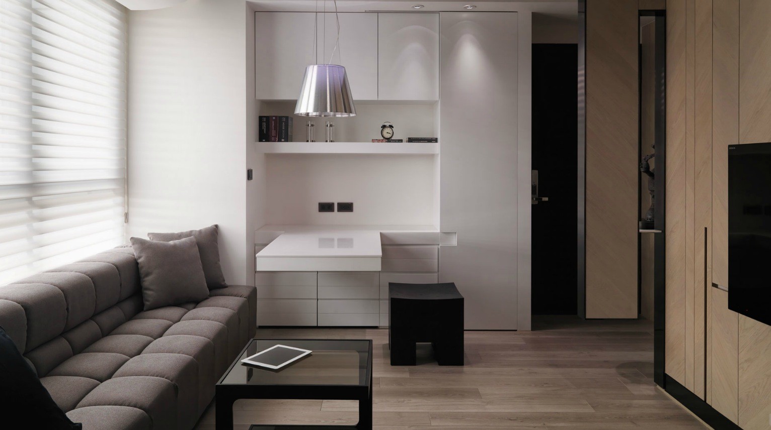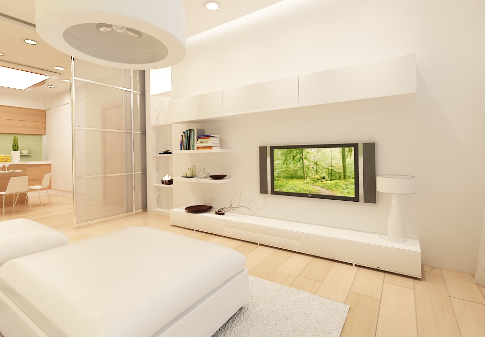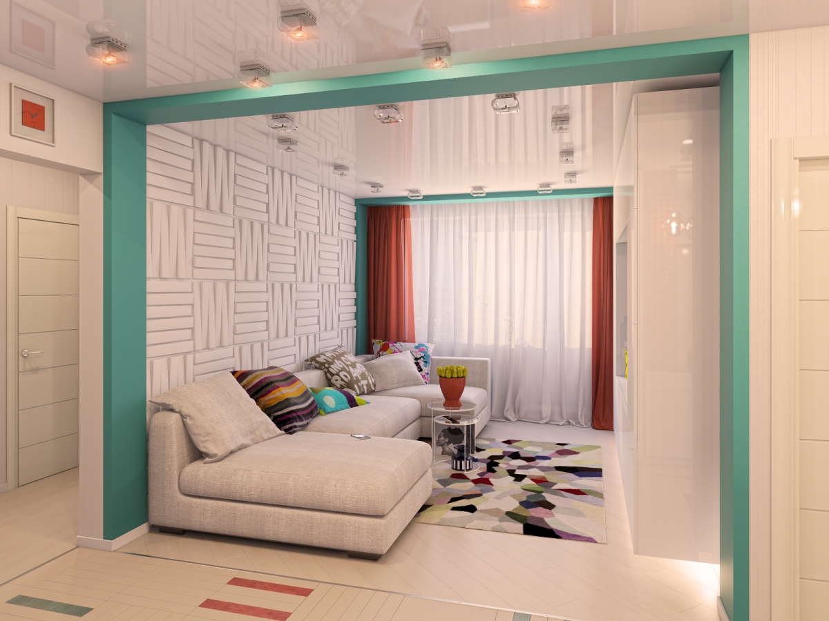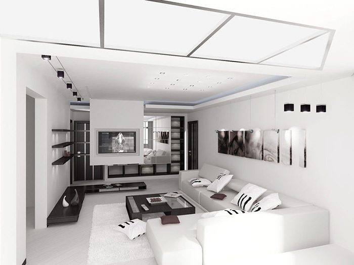 Минимализм любит просторные помещения. Как добиться этого в маленьких квартирах? Часто прибегают к перепланировке и объединяют гостиную с кухней, или превращают квартиру в студию, полностью убирая все возможные перегородки. В большом помещении выполняют зонирование с помощью освещения и разной отделки для каждой зоны. Например, кухню можно поднять на небольшой подиум. Ещё один вариант зонирования — использовать многоуровневые потолочные конструкции. Над гостиной можно установить натяжной глянцевый потолок, который визуально увеличит её объём.
