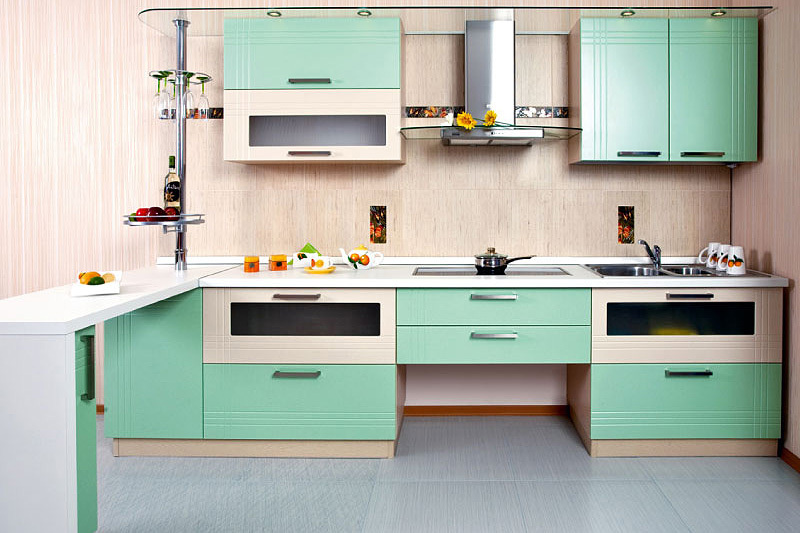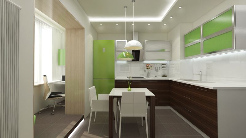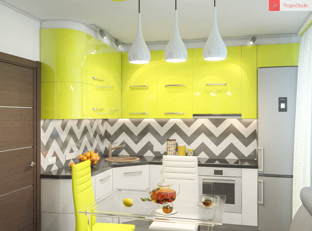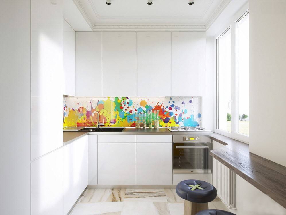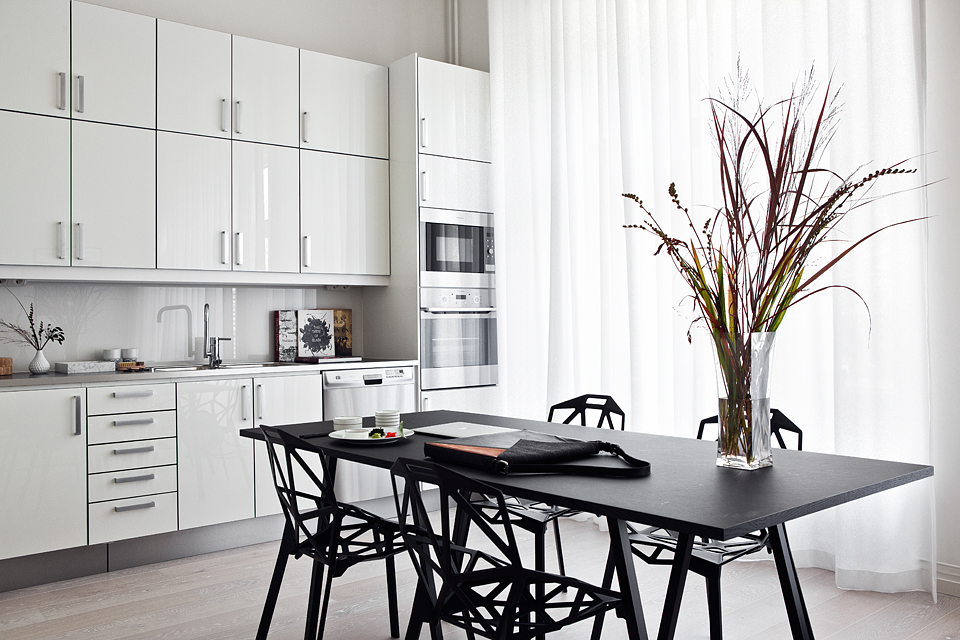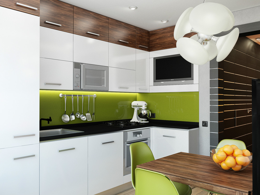 Интерьер в таком стиле подойдёт как для просторной кухни-столовой, так и для небольшой хрущёвки. Чтобы сэкономить место, используйте встроенную бытовую технику. Не закрывайте окно или окна шторами, пусть они впускают максимум света. Используйте стеклянные поверхности, которые растворяются в интерьере и создают ощущение лёгкости. Глянцевая отделка поможет визуально увеличить площадь кухни.