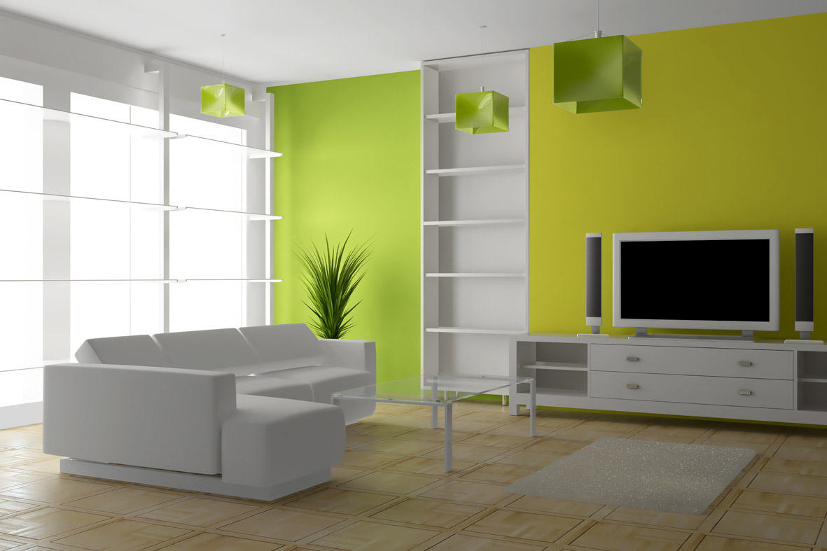 - Зелень и яркие цветовые пятна на общем однотонном фоне делают интерьер гостиной более живым и интересным
