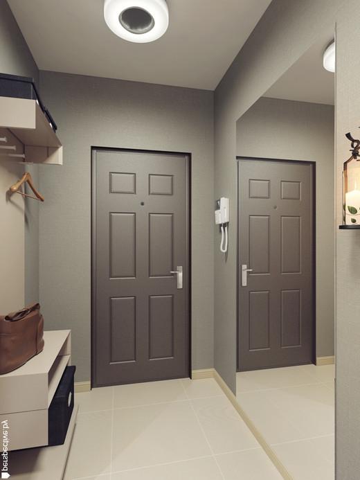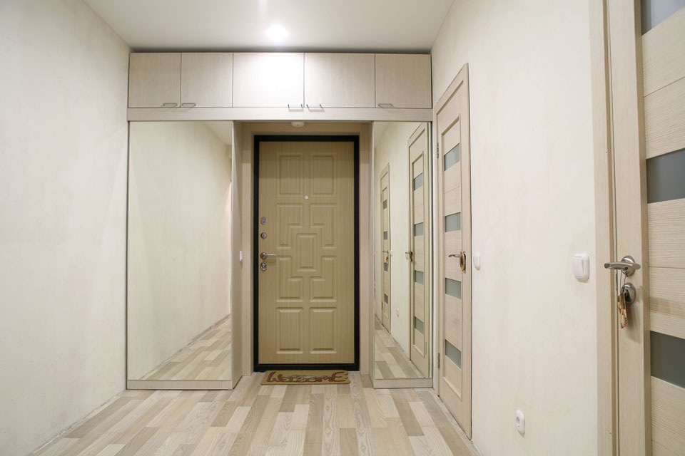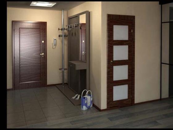 По прихожей формируется первое впечатление о квартире в целом и её хозяевах. Поэтому к дизайну этого помещения стоит подойти внимательно. В обычных квартирах, как правило, прихожие маленькие. Поэтому для оформления стен и потолка крайне желательно использовать традиционные для минимализма светлые цвета — белый и его оттенки. Чтобы зрительно увеличить пространство, можно также повесить на стене большое зеркало. Как вариант — поставить шкаф для вещей с зеркальными раздвижными дверями. Пол может быть тёмным.