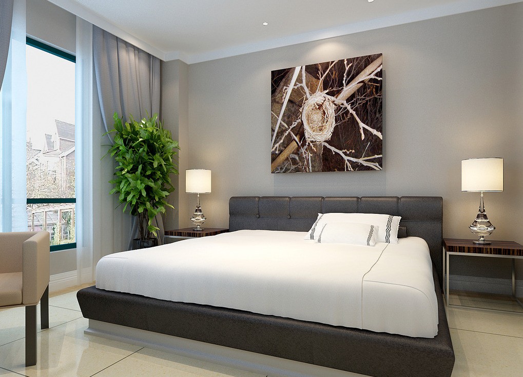 - Картина и комнатное растение прекрасно вписываются в интерьер спальни