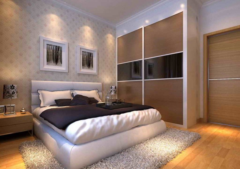 Дизайн спальни, как и любого другого помещения, разрабатывается с учётом общих требования минимализма. Особенностью является возможное использование штор, чтобы закрывать при необходимости окна. Обстановка состоит из минимума предметов мебели, среди которых — большая удобная кровать. Уместными будут встроенные шкафы с раздвижными дверями.