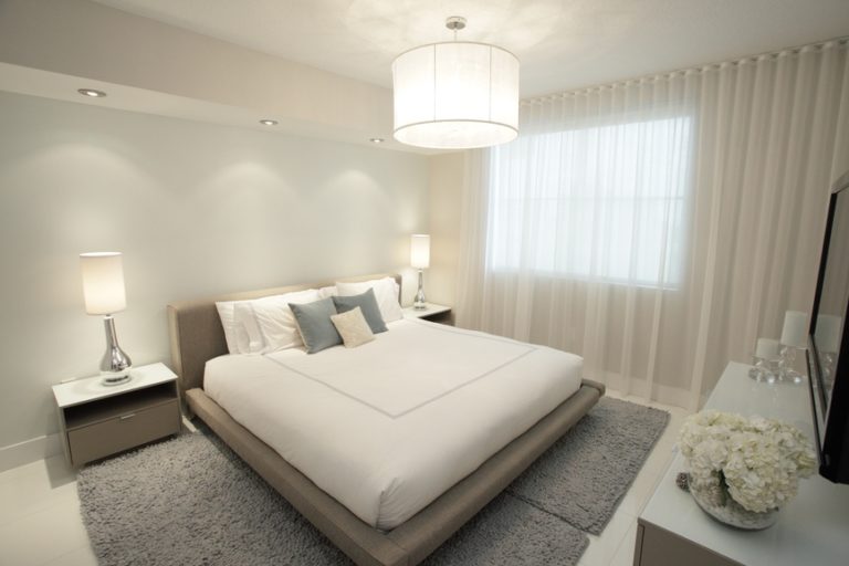 - При оформлении спальни допаскуется использование нехарактерных для минимализма штор, чтобы закрыть окна от посторонних взглядов