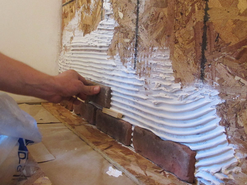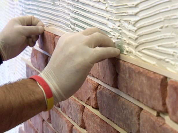 - Ровным шпателем раствор наносится на стену (около 1 кв.м) и на изнаночную часть камня слоем около 0,5 см. Зубчатым шпателем создается рифленая структура, для того, чтобы не удалять лишний раствор. Камень плотно прижимается к поверхности. Для надежности можно аккуратно постучать по плиткам резиновым молотком.