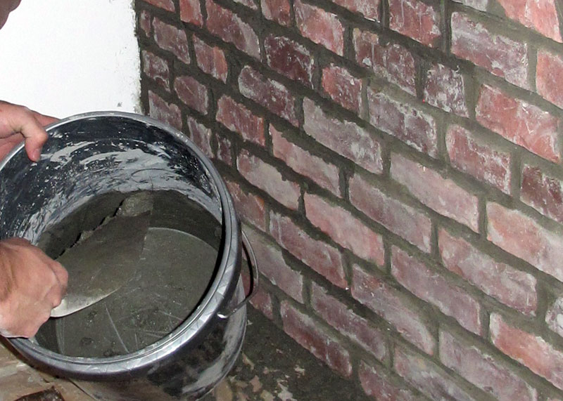 Подрезка каменных элементов производится в зависимости от места применения. Если нужен четко ровный шов для углов либо фигурная деталь для арки, архитектурного зеркала (декоративного элемента имитирующего окно), это делается болгаркой с алмазным кругом. Для боковых швов либо придания поверхности природного шарма, «каменные» элементы лучше обламывать широкими кусачками. Таким же образом заполняются швы между камнями.