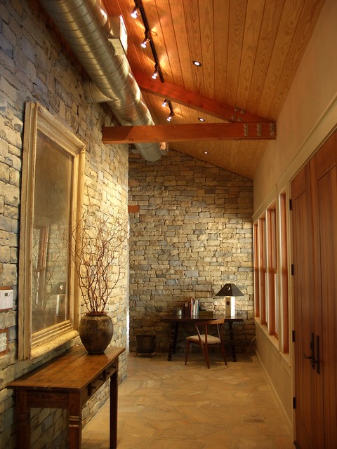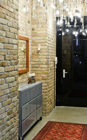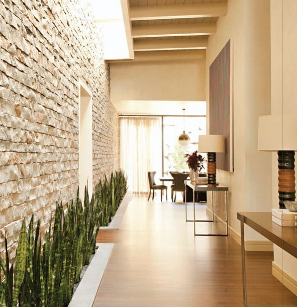 Но при этом следует учесть, что в длинных прихожих желательно делать вертикальные колоны другого оттенка на одинаковом расстоянии, это поможет создать уют и визуально приподнять потолок. Для маленьких коридоров необходим камень светлых оттенков. В больших помещениях рекомендуется делать фрагментарную облицовку или вставки из камней различной фактуры.