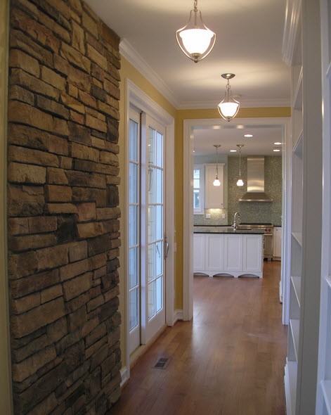 - После очистки и обработки поверхности грунтом приступаем к укладке. Отделка коридора камнем производится в определенной последовательности. Начинают с внешних углов, короткие и длинные элементы чередуются для создания красивой фактуры. Это в том случае, если выбранный вид камней имеет их в своих комплектах. Если такие элементы не предусмотрены, укладка ведется обычным способом снизу вверх. Далее укладывается основная площадь.