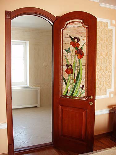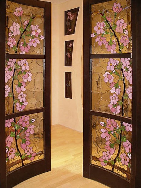 Особую популярность в отделке помещений заслуживают витражные дверные стекла. Создавать их можно собственноручно, имея полотно со стеклянными вставками и краски для витража. Сначала набросайте рисунок на бумаге, идентичной по размерам стеклу. Далее, достаньте стекло из полотна. Обезжирьте стеклянную поверхность и аккуратно перенесите изображение. Высыхание будет происходить примерно сутки, после чего можно будет аккуратно вставить стекло на место.