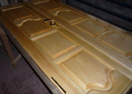 - Сначала снимите дверное полотно с петелек и удобно для себя расположите его на горизонтальной плоскости. Всю фурнитуру, по традиции, вынимаем.