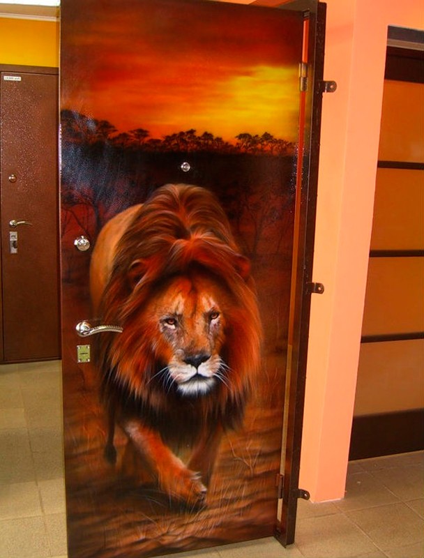 А вот еще один оригинальный вариант оформления двери, в данном случае, частичного. Если вы чувствуете, что не осилите собственноручно покраску или шпонирование, подарите оригинальный новый вид полотну, наклеив виниловый стикер. Картины, созданные из пленки, скрывают дефекты и наносятся при помощи мягкой губки всего за пару минут.