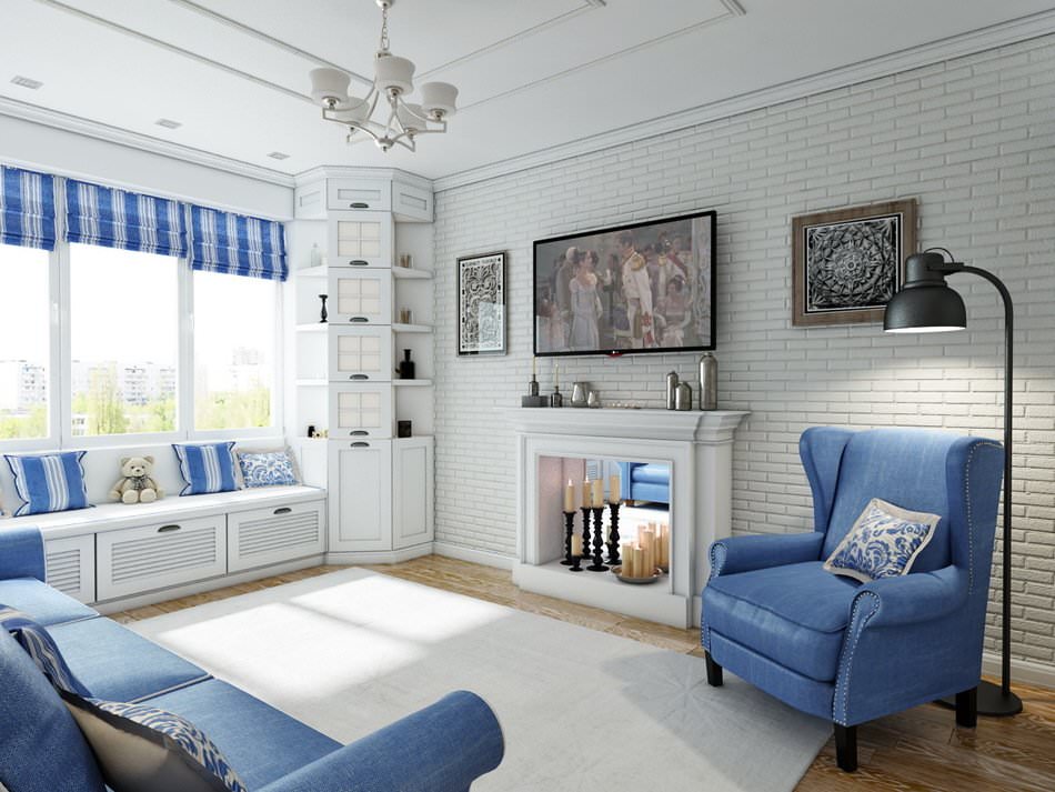 - Маленькая гостиная в бело-голубых тонах с использованием римских штор