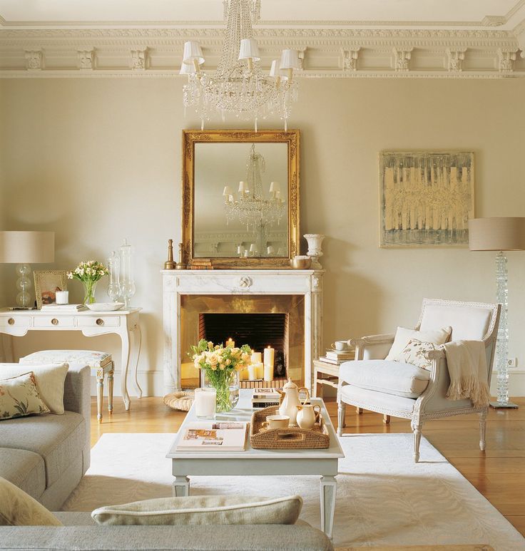 - Зеркало над камином в роскошной раме часто встречается в гостиных в стиле прованс