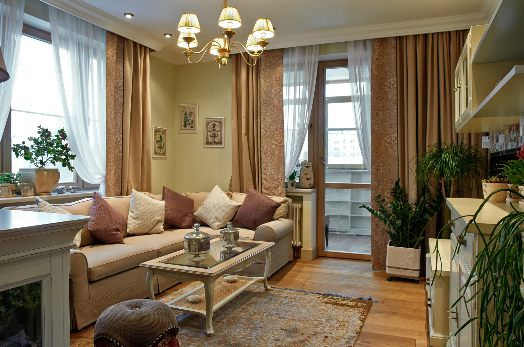 - Бежево-коричневые тона гостиной удачно дополены растениями
