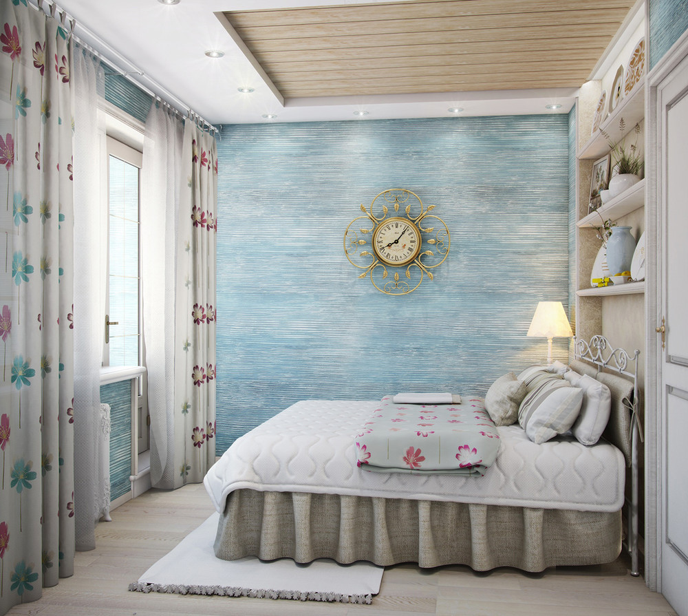 Вместо большой кровати используем складную — её можно легко убрать в нишу, или заменяем диван. Используем лёгкие, тонкие ткани для декора окон. Отдаём предпочтение нежным оттенкам голубого или розового.
