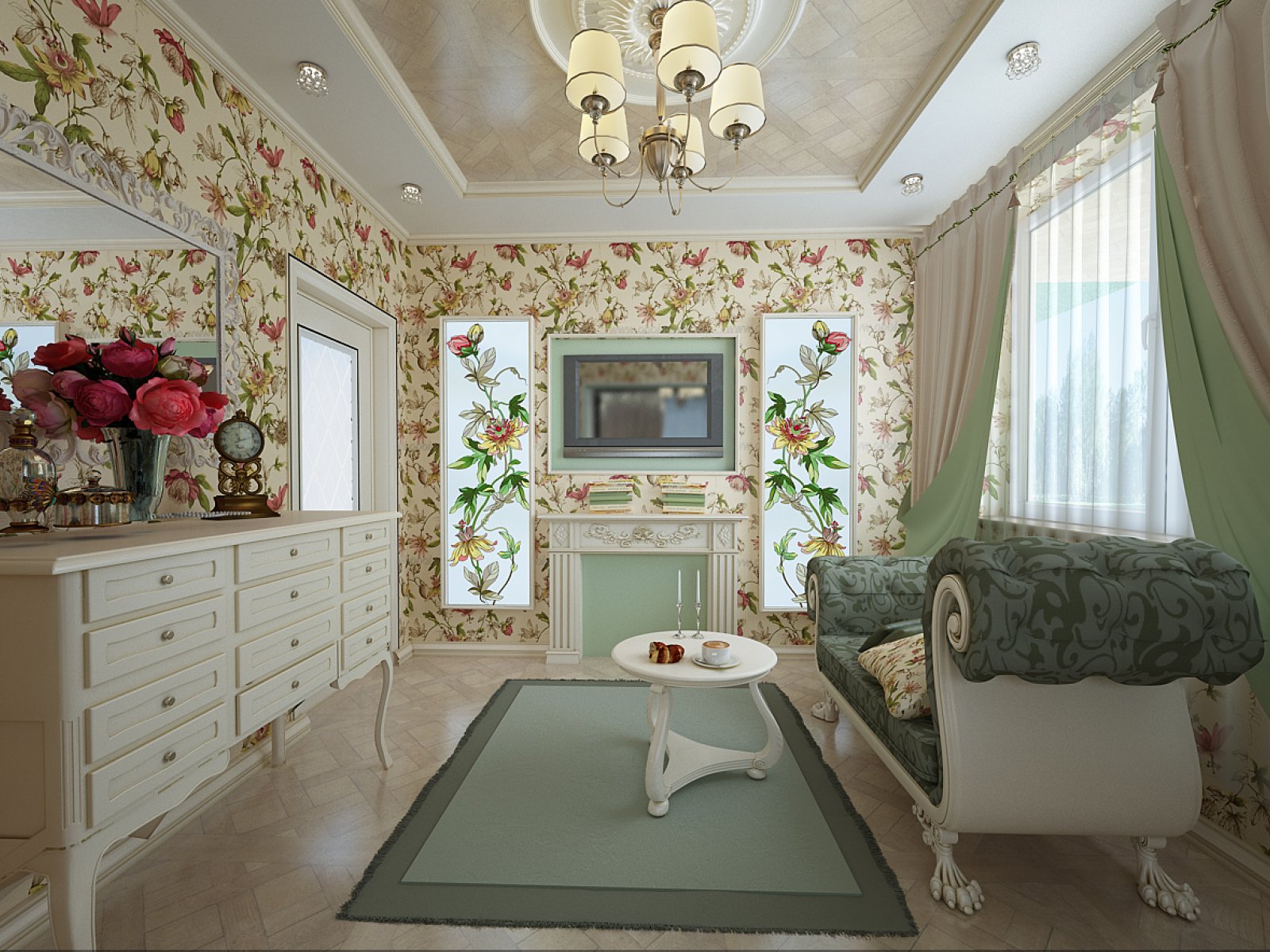 - Цветочный рисунок повторяется на шторах, обивке мебели и занавеске