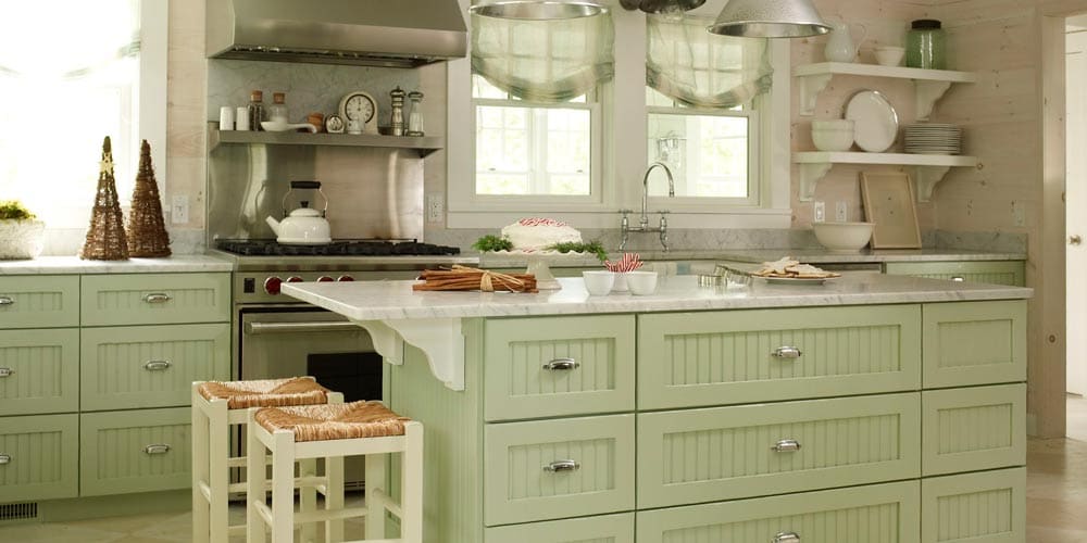 Мебель для кухни следует подбирать светлого цвета, с плавными линиями. Кухонные шкафчики с небольшими царапинками на фасадах, стеклянными вставками.