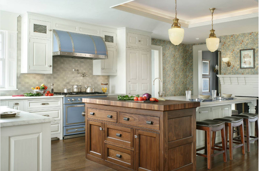 Посудный шкаф и открытые полки всегда используются на кухне. Они могут быть в цвет стен, или более яркими, но обязательно из натуральных пород дерева.
