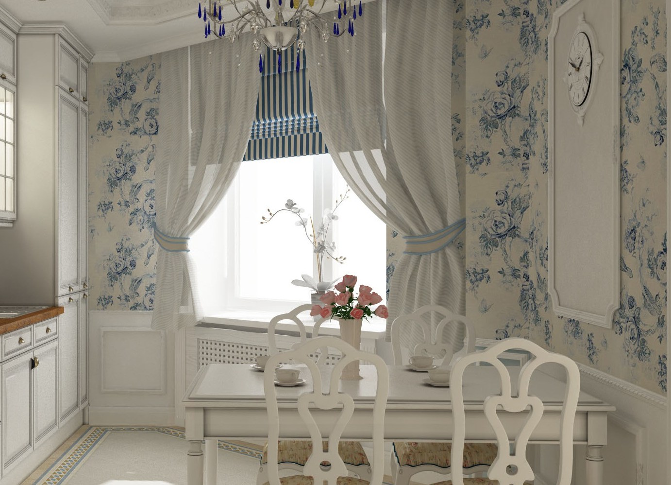 - Нежный цветочный рисунок на шторах подчёркивают резные спинки стульев