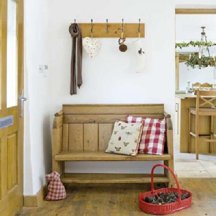 - Минимум мебели — вешалка и скамеечка из натурального дерева