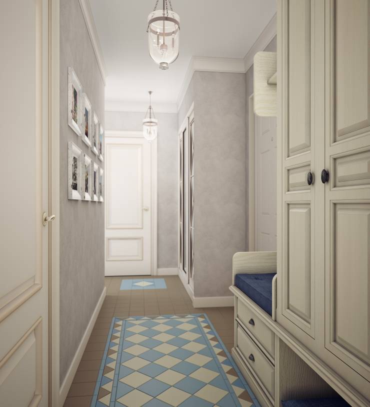 Прихожая, как правило, имеет небольшой размер. Для её оформления используется минимальное количество мебели. Важно сохранить свободное пространство и визуально увеличить его — для этого можно использовать большое зеркало во весь рост в массивной раме. Для оформления прихожей используются только светлые тона — бежевый, белый, нежно-голубой, лавандовый.