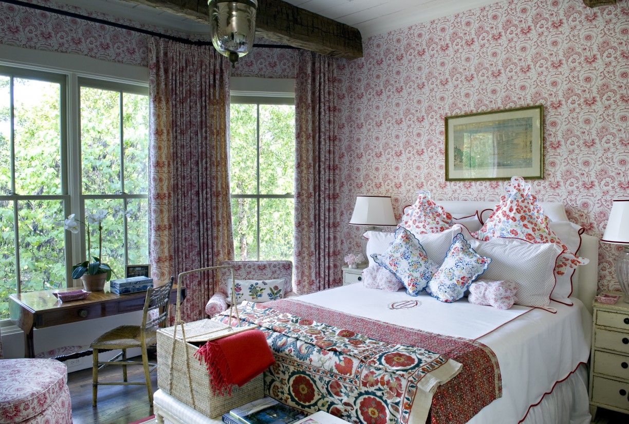 Кровать всегда с большим количеством декоративных подушек самых разных форм и размеров. Они могут быть в тон основному цвету интерьера или в тон штор — с цветочными принтами.