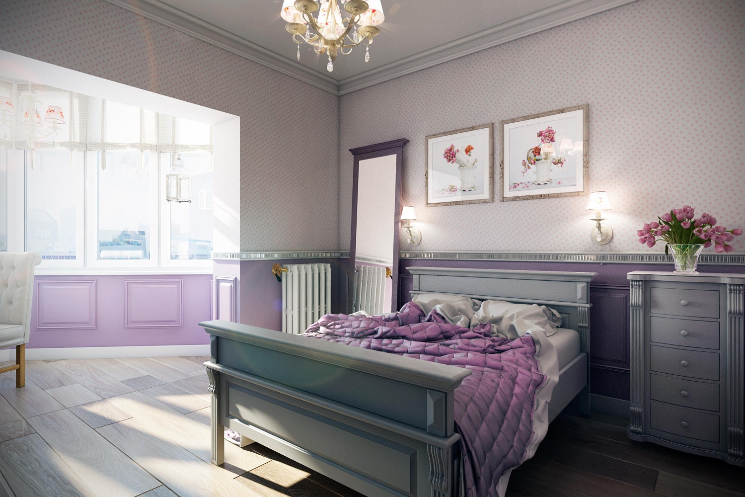 - Цвет лаванды в сочетании с белым придаёт спальне дополнительный объём