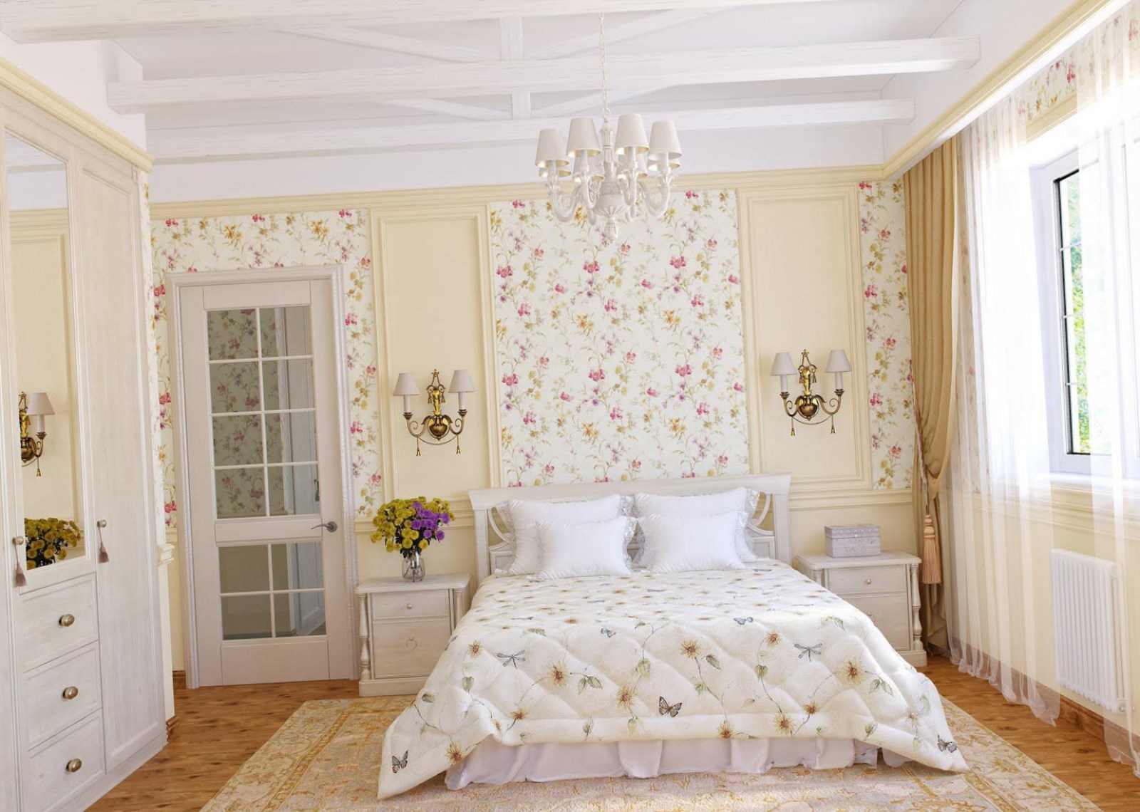 Для прованса нехарактерно использование обоев. Но в интерьере городской квартиры вполне можно встретить обои с рисунком, имитирующим камень, или обои с цветочным рисунком — как мелкие букеты, так и крупные цветочные принты. Ими оклеивают либо одну стену, либо часть стены. Для оформления спальни не следует применять обои на виниловой или флизелиновой основе.